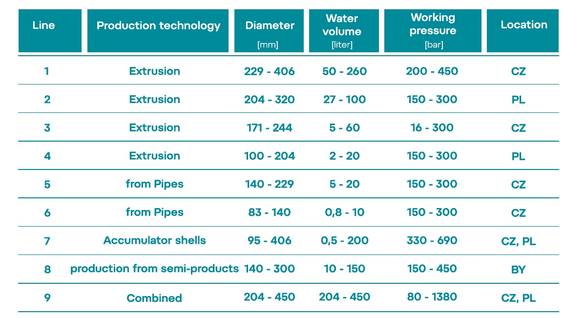 Cylinders Holding uses 9 production lines which cover the wide production portfolio of cylinders, tanks, pressure vessels, H2 storage vessels and accumulator shells, as shown in the table below.